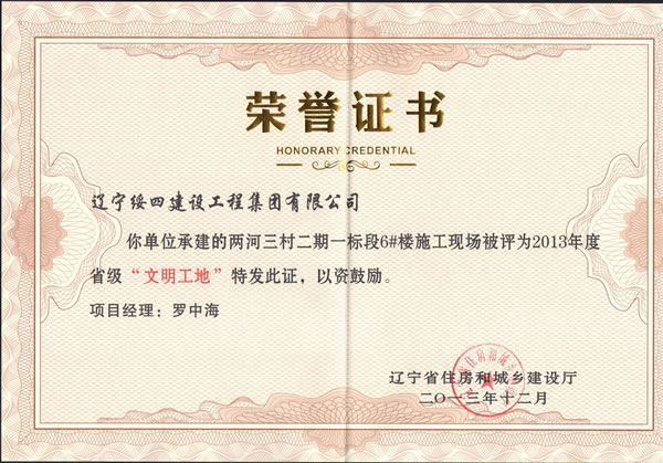 2013年12月由羅忠海項目部承建的兩河三村二期一標(biāo)段6#樓施工現(xiàn)場被遼寧省住房和城鄉(xiāng)建設(shè)廳評為2013年度省級“文明工地”。