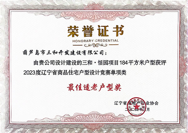 本次競(jìng)賽以“好房子服務(wù)美好生活”為主題,活動(dòng)一經(jīng)發(fā)布,我單位市場(chǎng)開發(fā)副總凌旭作為主要設(shè)計(jì)人,聯(lián)合其它設(shè)計(jì)人員積極申報(bào)戶型設(shè)計(jì)方案。經(jīng)過(guò)專家評(píng)審,我單位獲得1項(xiàng)綜合類獎(jiǎng)、2項(xiàng)單項(xiàng)類獎(jiǎng)。其中,應(yīng)用于三和榮郡居住小區(qū)二期工程的135平方米戶型,榮獲綜合類“優(yōu)秀戶型獎(jiǎng)”;應(yīng)用于三和宜興園小區(qū)工程的85平方米戶型,榮獲單項(xiàng)類“最佳青年戶型獎(jiǎng)”;應(yīng)用于三和恬園小區(qū)二期工程的184平方米戶型,榮獲單項(xiàng)類“最佳適老戶型獎(jiǎng)”。