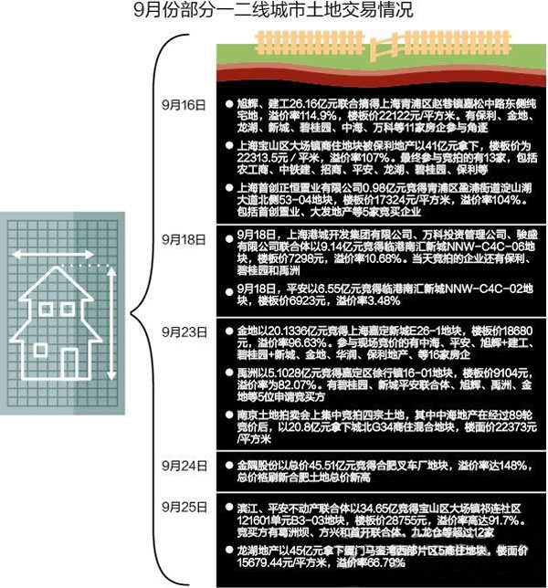 同樣的情況也發(fā)生在其他城市。9月23日,南京土地拍賣會(huì)上集中競拍四宗土地,其中中海地產(chǎn)在經(jīng)過89輪競價(jià)后,以20.8億元拿下城北G34商住混合地塊,樓面價(jià)22373元/平方米,創(chuàng)造了南京的樓面價(jià)新高。9 月24日,金隅股份以總價(jià)45.51億元競得合肥叉車廠地塊,溢價(jià)率達(dá)148%,總價(jià)格創(chuàng)下合肥土地總價(jià)新高。在廈門,9月25日一向行事穩(wěn)健的龍湖地產(chǎn)以45億元拿下廈門馬鑾灣西部片區(qū)5商住地塊,樓面價(jià)15679.44元/平方米,溢價(jià)率66.79%,無論是總價(jià)還是樓面價(jià)格都創(chuàng)造了廈門當(dāng)?shù)氐男赂摺?/FONT>