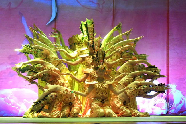 演出在大氣磅礴的聾啞人舞蹈《共筑中國夢》中拉開帷幕,男聲獨唱《中國人》、雜技《空竹》、器樂獨奏《苗嶺的早晨》、無臂口寫書法表演、舞蹈《千手觀音》等10余個豐富多彩的節(jié)目依次上演。其中,無臂口寫書法家郎文東以口代筆書寫的“厚德載物”,其剛勁大氣的書法,讓觀眾驚嘆不已。壓軸登臺的《千手觀音》則將整場演出推向了高潮,聾啞演員們用變幻莫測的手姿,劃出一道道優(yōu)美的金色弧線,給人以視覺的享受和心靈的震撼。