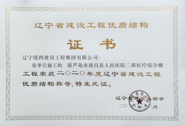 “葫蘆島市建昌縣人民醫(yī)院二部醫(yī)療綜合樓”榮獲2020年度遼寧省建設(shè)工程優(yōu)質(zhì)結(jié)構(gòu)稱(chēng)號(hào)